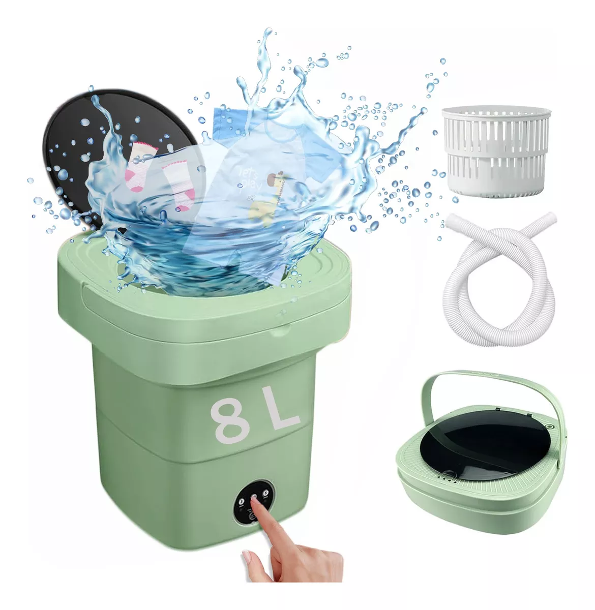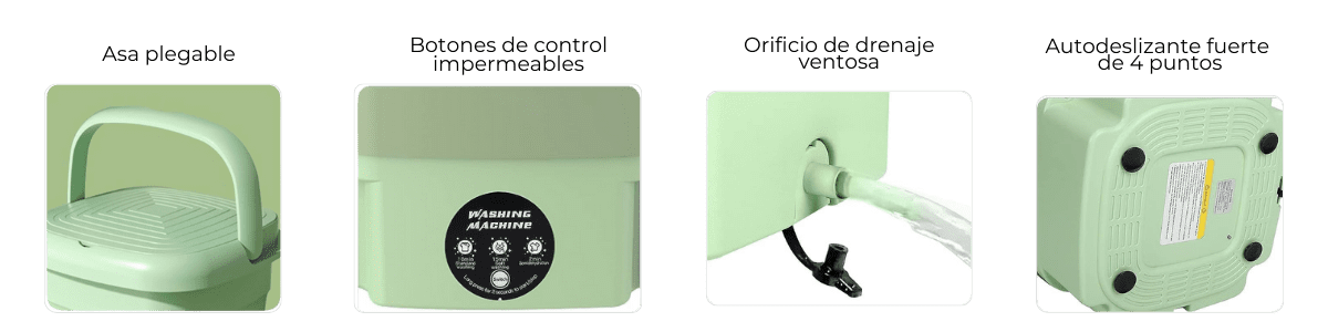 La lavadora portátil está diseñada con una gran capacidad de 8 L, lo que le permite lavar varias cargas a la vez, ahorrando tiempo y agua.